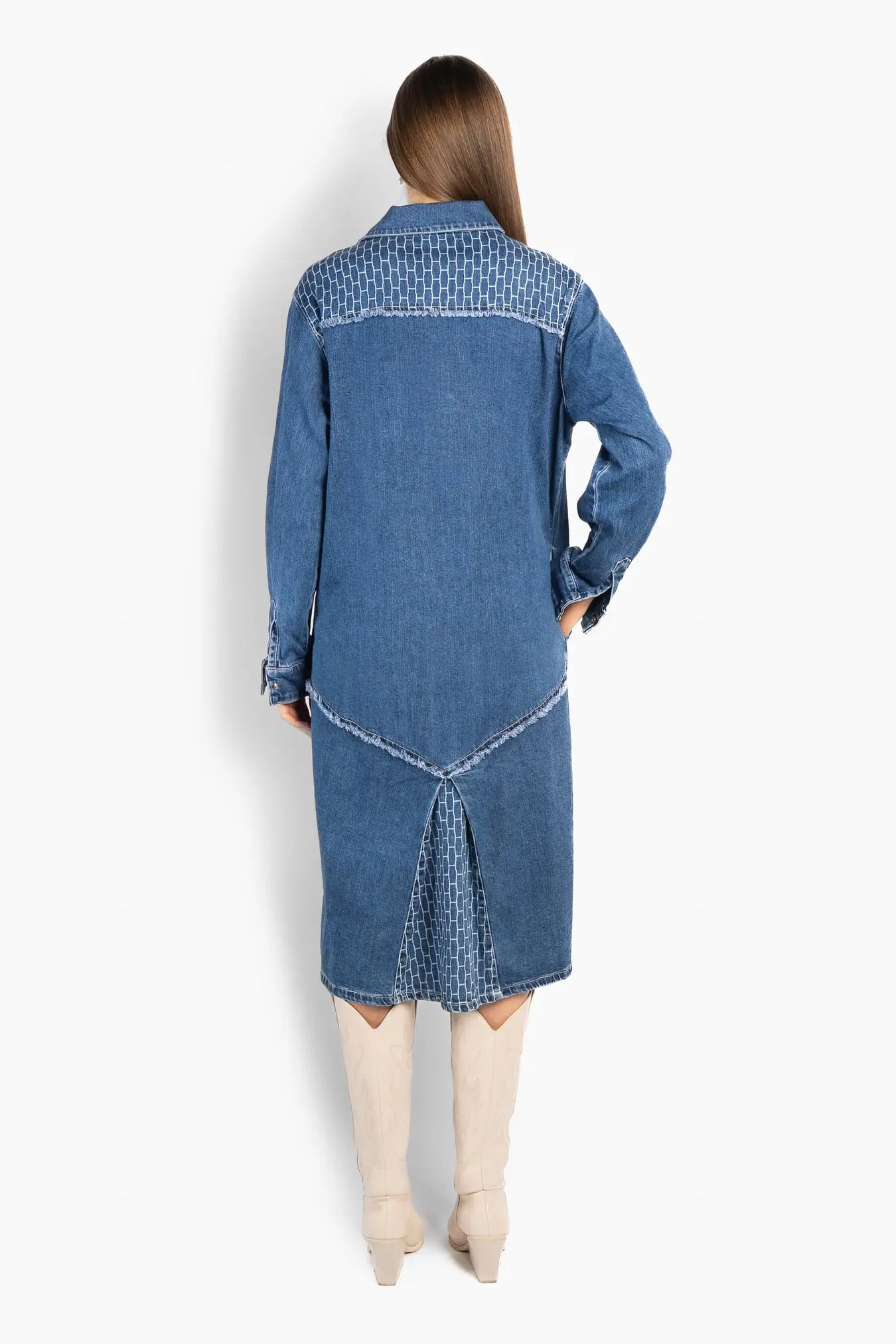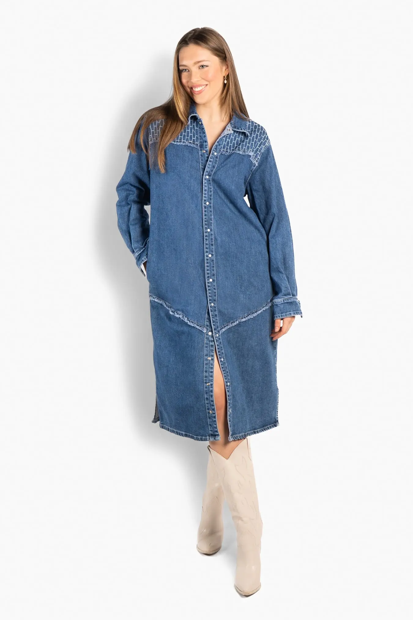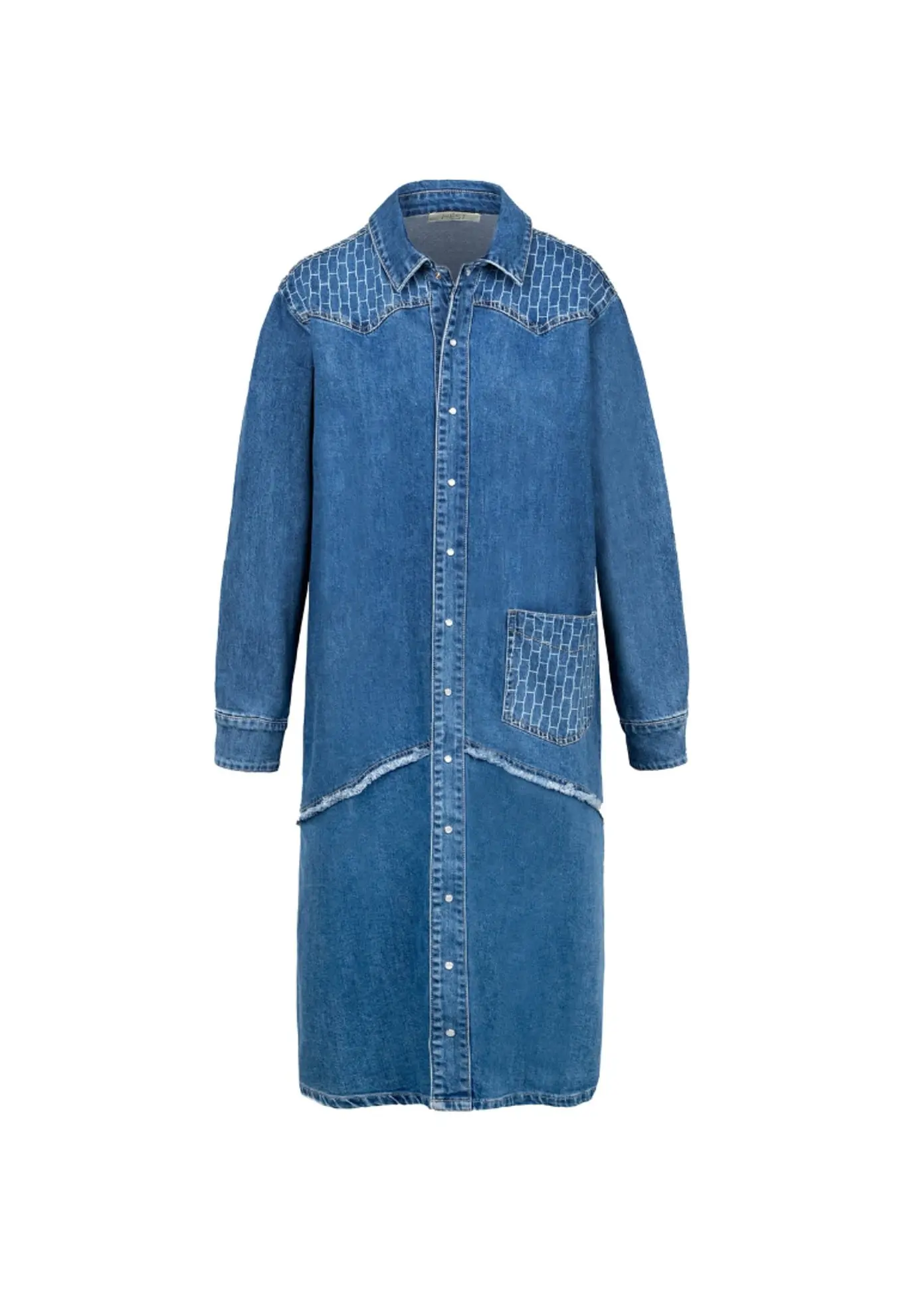 Dharma-klänningen är en skjortklänning i denim med en avslappnad silhuett och en ren, strukturerad känsla. Tillverkad i mjuk denim erbjuder den bekvämt slitage med ett naturligt fall. Den har en klassisk krage, knäppning framtill och subtila HÉST-inspirerade mönsterdetaljer vid oket för en distinkt touch. Ett mångsidigt plagg som fungerar lika bra ensamt som i lager för en mer stilren look.