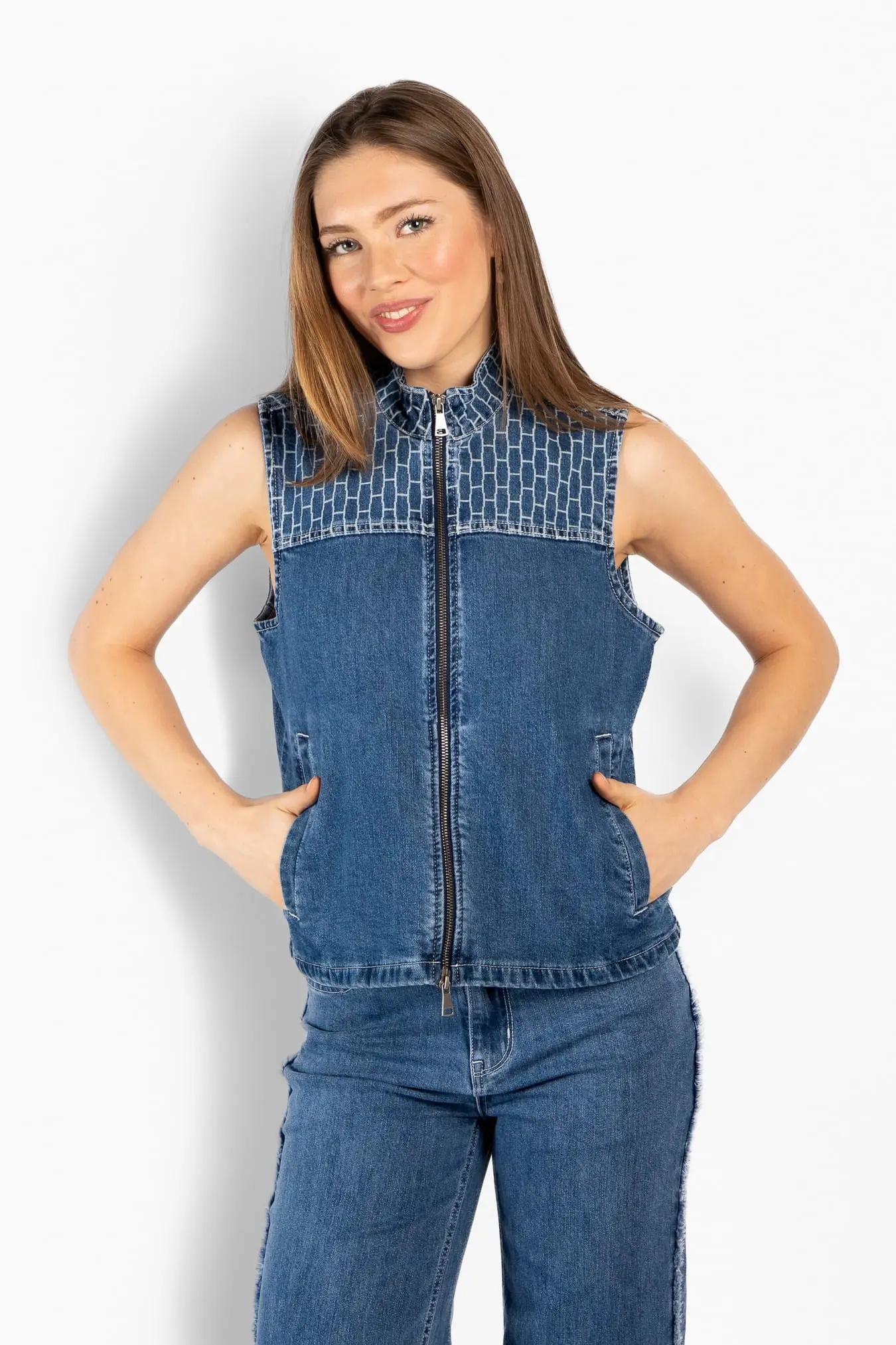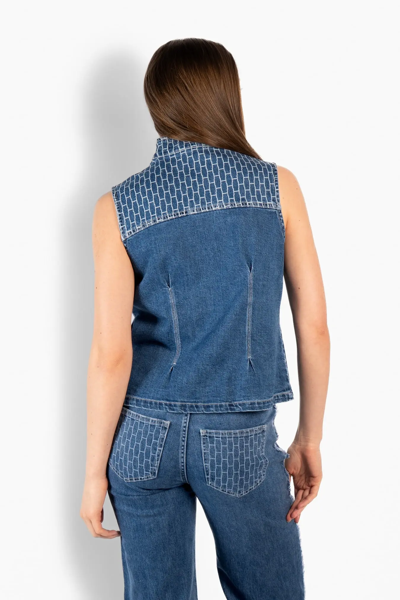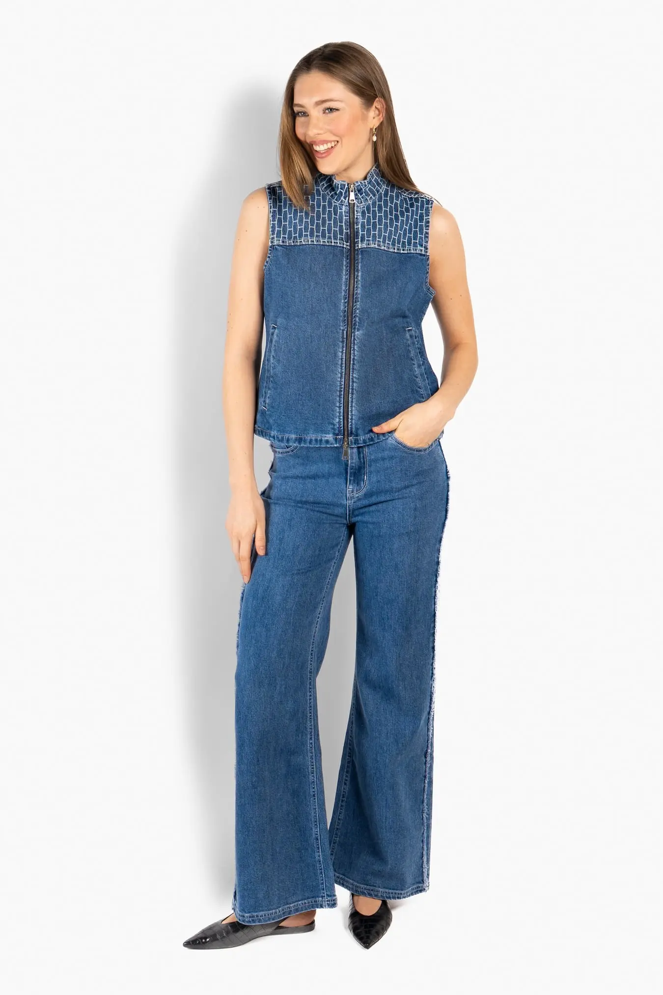 En jeansväst med en strukturerad men ändå avslappnad silhuett. Den har en hel dragkedja framtill, ståkrage och subtila HÉST-inspirerade mönsterdetaljer vid oket
