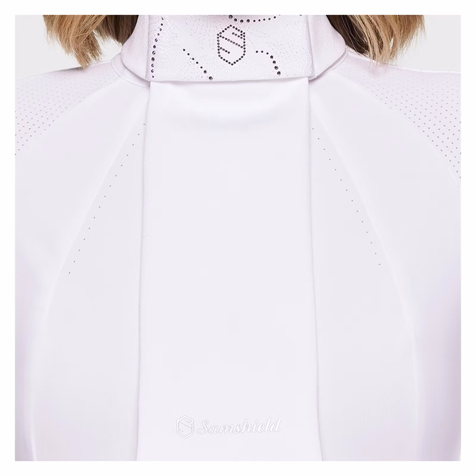 Premiumdetaljerna gör hela skillnaden: Ferna-broderi ton-i-ton förstärkt av en Swarovski-kristalldekoration, Samshield-kontur på Ferna och Samshield-logotypen i slutet av haklappen. Ett raffinerat och funktionellt plagg, designat för att kombinera stil och prestanda.